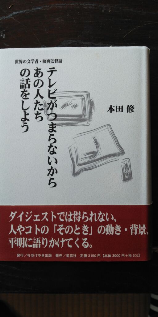 私の高校2年次に山岳部副顧問をされていた本田修先生が書かれた本です。現役当時も結構熱い先生だな~という印象を持っていたのですが、文学者や映画監督についてそうとう熱いトーンで辞書並みのページを一気に書かれています。ほぼ絶版で入手は困難だと思うのですが、Amazonなんかでもかなり高い評価を得ています。(https://www.amazon.co.jp/%E3%83%86%E3%83%AC%E3%83%93%E3%81%8C%E3%81%A4%E3%81%BE%E3%82%89%E3%81%AA%E3%81%84%E3%81%8B%E3%82%89%E3%81%82%E3%81%AE%E4%BA%BA%E3%81%9F%E3%81%A1%E3%81%AE%E8%A9%B1%E3%82%92%E3%81%97%E3%82%88%E3%81%86%E2%80%95%E4%B8%96%E7%95%8C%E3%81%AE%E6%96%87%E5%AD%A6%E8%80%85%E3%83%BB%E6%98%A0%E7%94%BB%E7%9B%A3%E7%9D%A3%E7%B7%A8-%E6%9C%AC%E7%94%B0-%E4%BF%AE/dp/4434048031)