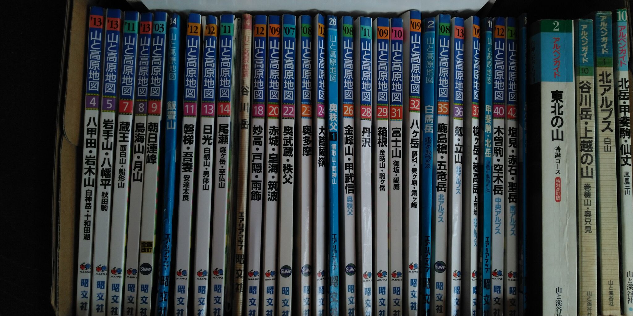 最近は最新情報はアプリで済ませることが多く、ほとんど紙では買わなくなっている山と高原地図。私のこれまで購入した過去のもの(のうち現存するもの)をヒュッテに持って上がりました。実際に行くときは最新の情報を入手してほしいですが、ヒュッテで山行イメージを立てるのにぜひともお役立てください。机の下の黒い箱の中に入っています。また、朝日新聞社の「日本百名山」シリーズ(初回分)はずいぶん前に文庫に入っていますので、併せて活用ください!