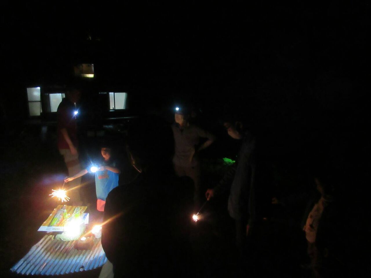 その間雨は降ったりやんだりでしたが、夕飯を食べ終わる頃には何とか止んだので、みんなで外に出て花火をして楽しみました。