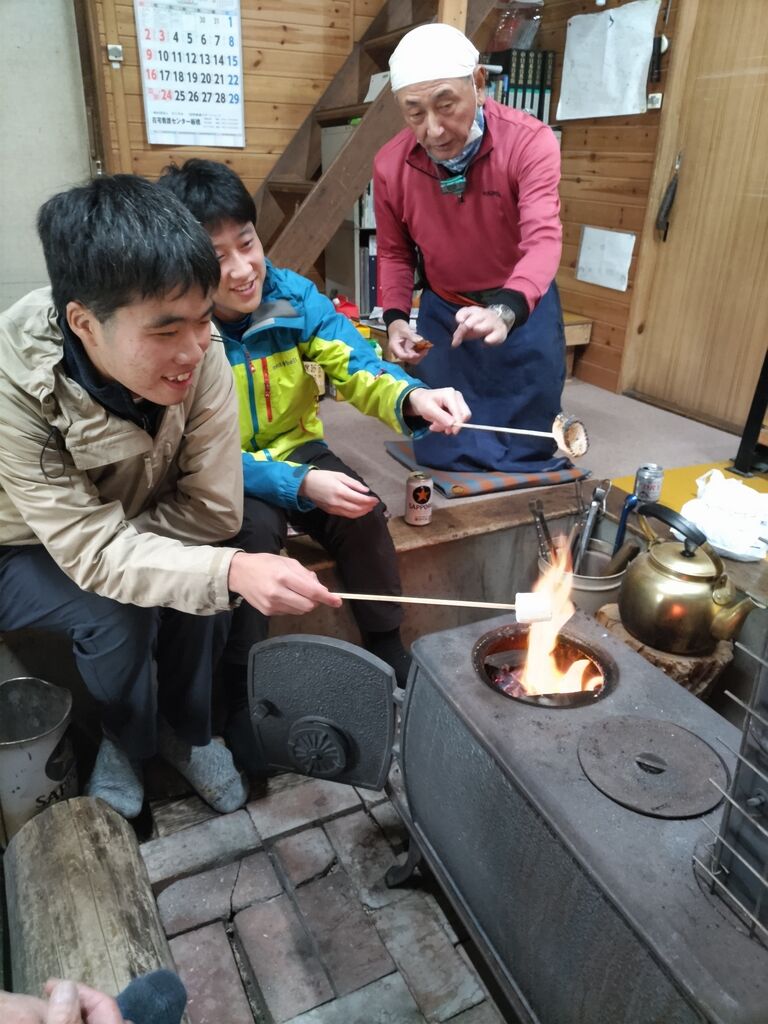 初日作業後、ヒュッテ内の薪ストーブで「焼きマシュマロ」に興ずる若手OB
