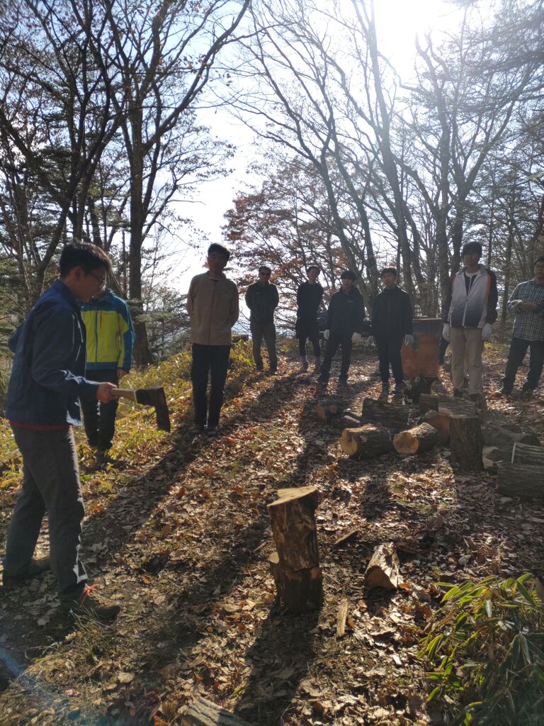 山岳部現役生たちを前に、薪割りのノウハウを伝える若手OB