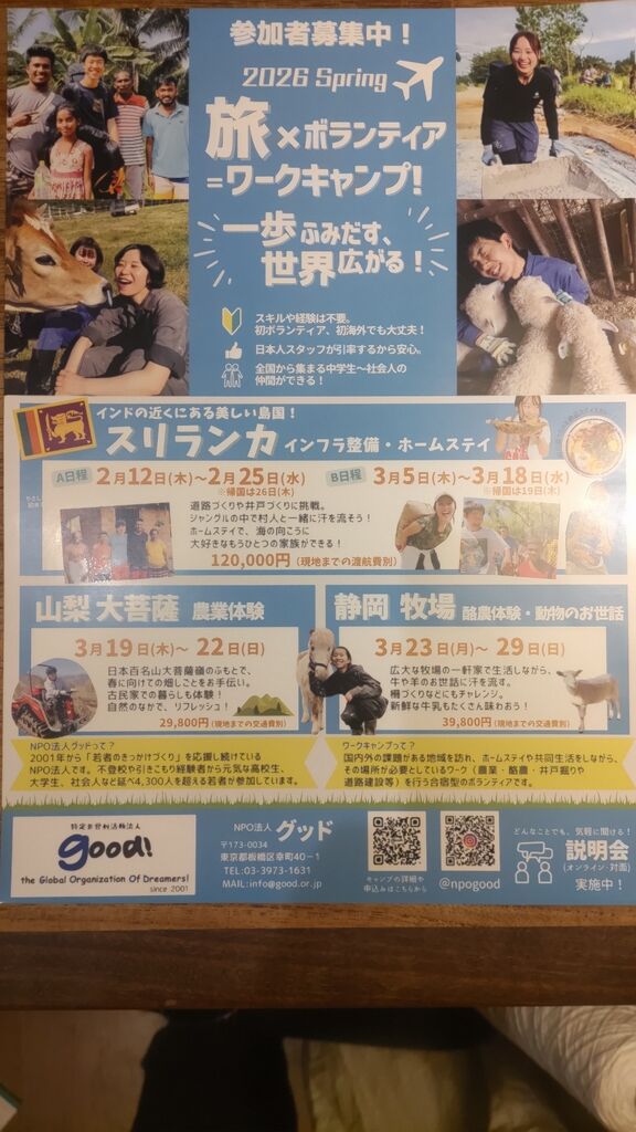 NPOグッドさん。不登校や引きこもり経験者から元気な高校生,大学生,社会人などを参加者に、ホームステイや共同生活をしながら、そこで必要としているワークを行う合宿型のボランティアを行っている団体です。国内だけではなくスリランカやモンゴル等海外にも遠征するアグレッシブな団体です。