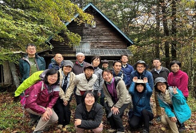 人に心からの感謝を伝え、山荘の前で皆で記念写真を撮影した。 さらに、本来であれば富士山が見えるはずの裏庭のスポットでも集合写真を撮り、この旅の思い 出を形に残した。後ろ髪を引かれる思いで、私たちは別れを告げ上日川峠へ向けて、足早に歩き出した。山荘の温もりを背中に感じつつ、次の再会