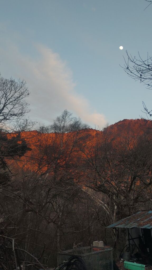 1/1 福ちゃん荘前から稜線を染める夕陽とお月様。